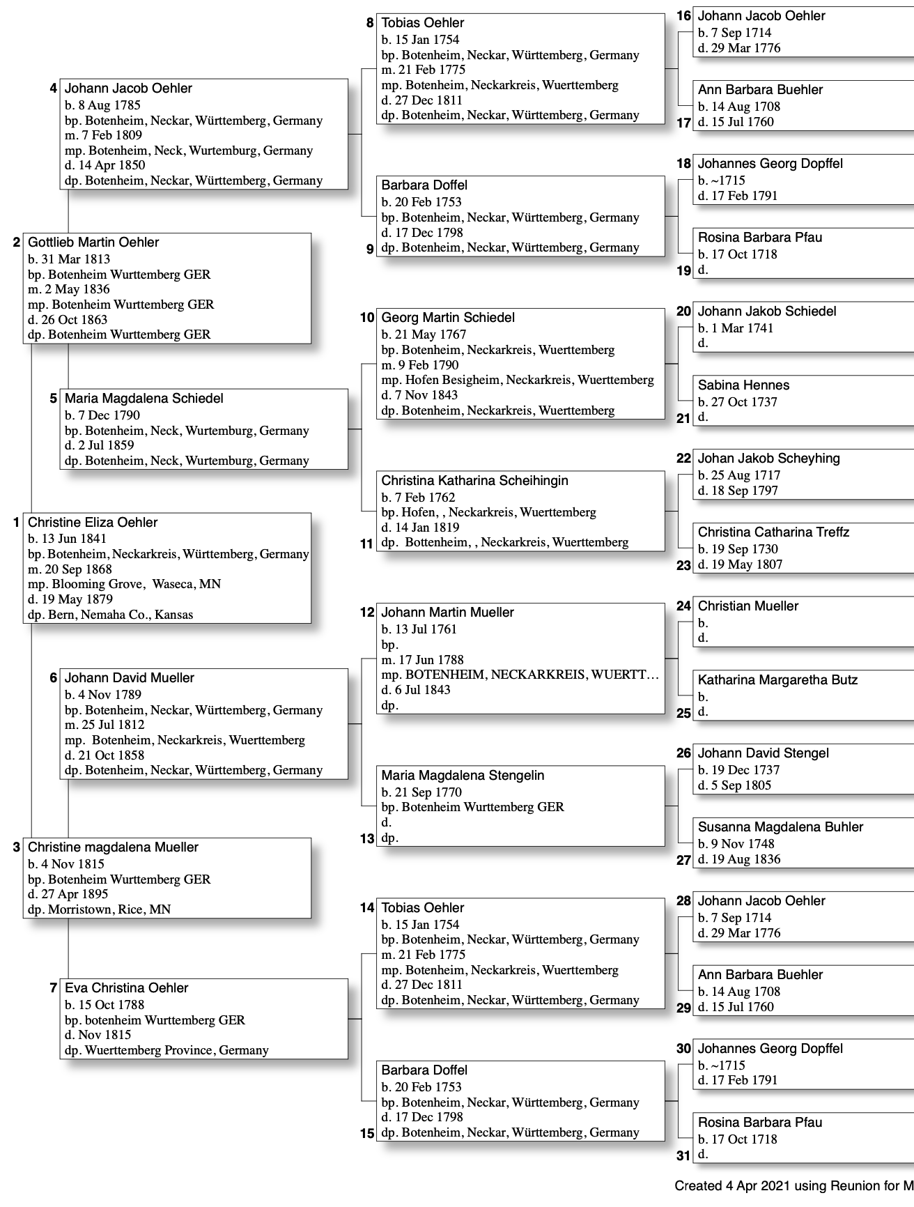 Tobias Oehler, born 8 Sep 1822 in Botenheim, Heilbronn, Germany, was an uncle of the Oehlers who went to Minnesota in 1868. Tobias arrived in the United States on 23 Feb 1854 on the S. S. Bavaria, and was living in Blooming Grove, MN in 1868 when the group arrived. Gottfriend David Oehler was a brother of Tobias, born 4 Jul 1827 in Botenheim. Gottfried David Oehler [6] arrived in the United States about 1851, and was in Morristown, Rice Co., MN for the 1865 Minnesota Census. Gottlob Oehler was a brother of Christine Oehler living in Blooming Grove, MN; he came to the United States in 1867.