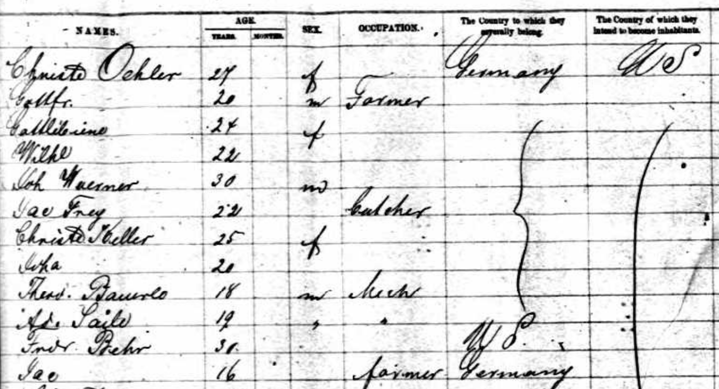 1. Christine Oehler, age 27, who is Christine Elizabeth Oehler, born 13 Jun 1841 in Botenheim, Heilbronn, Wurttemberg, Germany, who married Johann Werner a year after their entry into the US. 2. Gotfried Oehler, age 20, is Christine Oehler’s brother, born 15 Aug 1848 in Botenheim, Germany, died
