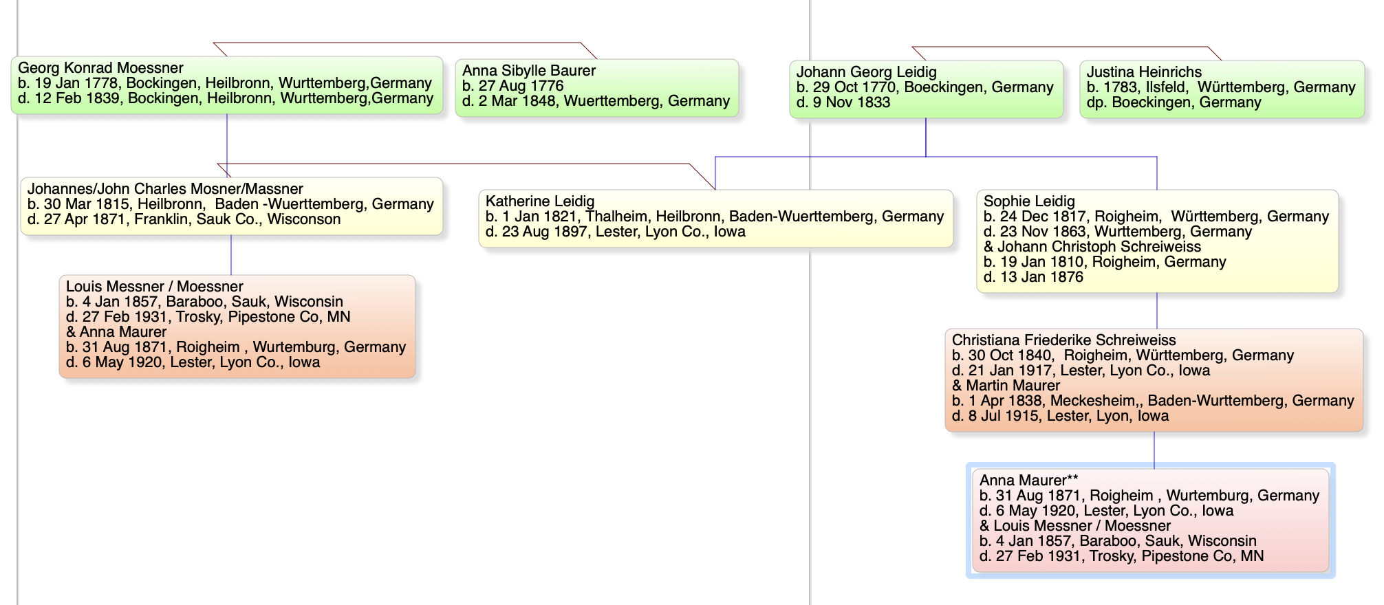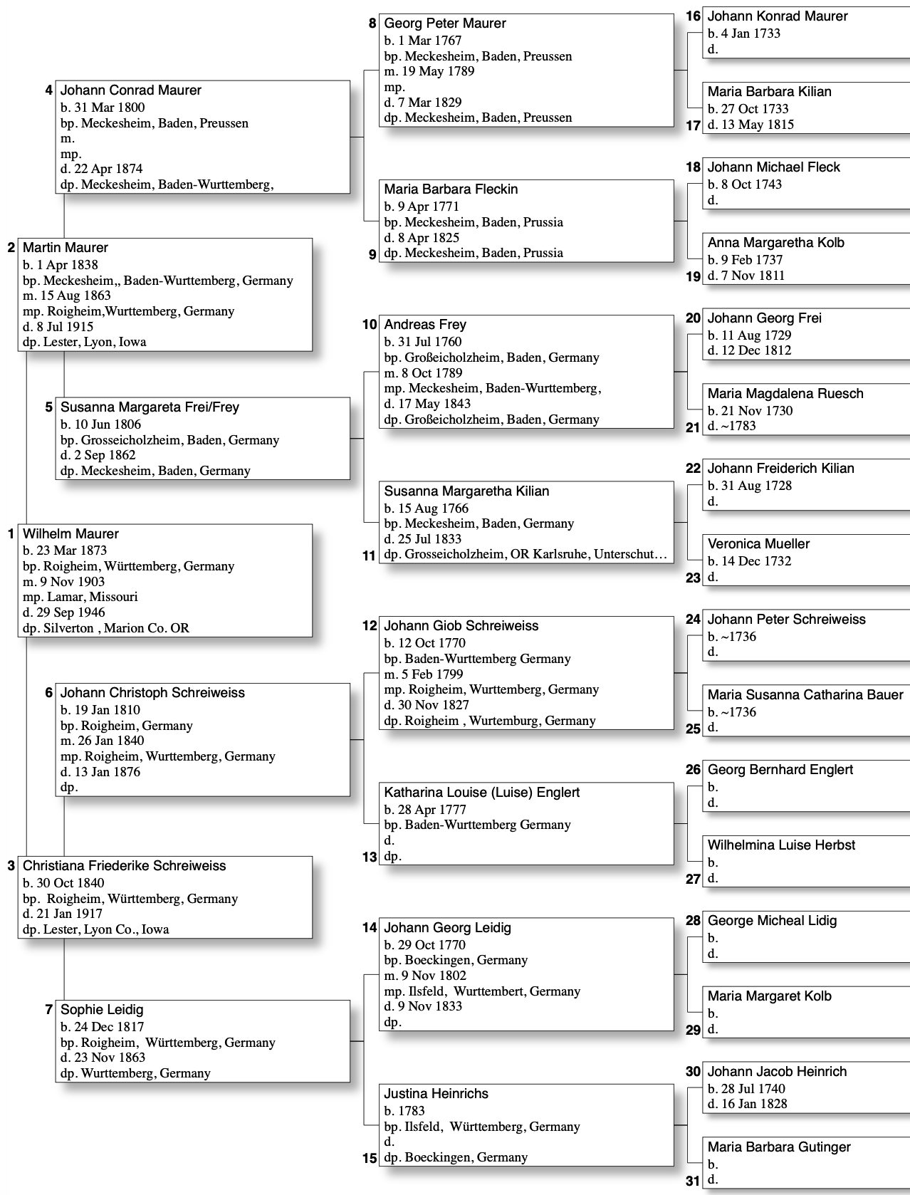 Johann Conrad Maurer (1800-1874), father of Martin, was an innkeeper and butcher in Meckesheim as his father had been before him. The inn was the Gasthaus Zum Lamm; in 2021 it still exists as an inn in Meckesheim. His father, George Peter Maurer (1767-1829), was raised in Meckesheim by his uncle’s family, and like his uncle became a butcher and innkeeper in the same village. Georbe Peter Maurer’s father was Johann Konrad Maurer (1733- ) who was born in Meckesheim; his father, Johan Konrad Maurer (1695-1745) was an innkeeper in Mecheksheim and owned the inn “Zum Ochsen”. [1]